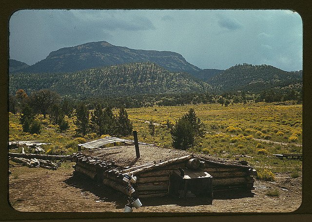 photographer. Dugout house of Faro Caudill, homesteader with Mt. Allegro in the background, Pie Town, New Mexico