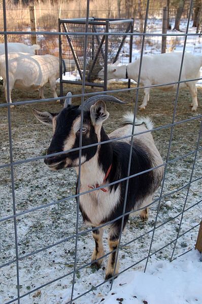 https://commons.wikimedia.org/wiki/File:Arapawa_dairy_goat.jpg# The Arapawa Goat is a breed of feral goat descended from Old English milch goats released on Arapawa Island off the coast of New Zealand. It is directly descended from a breed of English landrace goat which no longer exists in its native England. Extremely rare today, a few have been exported to North America and other regions. These goats were originally put on Arapawa by the inhabitants of the bay named Te Awa Iti Whaling Station in the early 1800s. The Arapawa Goat is a delightful breed which happily settles down with other breeds of goat when kept in captivity.