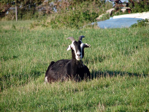 https://upload.wikimedia.org/wikipedia/commons/1/1c/Goat_at_Offley_-_geograph.org.uk_-_245154.jpg The British Alpine is quite a large goat in appearance. They are normally black with white Swiss markings, however sometimes a fully black animal may occur, often known as "all black" or "black Saanen" goats. This is due to a recessive gene. British Alpine goats have a typical "wedge" shape that is predominant in some other breeds of dairy goat.