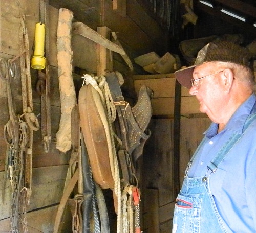 The day came when Dad took the crosscut saw down from the barn rafters to sharpen its mighty teeth with special files. My oldest brother, Edward shouldered the sharp saw, and he and Mama took off for the woods. Dad gathered the leather harness from the gear room, and then went to fetch Kate. Walking through the pasture, Dad caught her by the halter and then led her to the barn. He checked her teeth, feet and ears, assuring himself that she was in good health. Slowly he worked a sugar-coated metal bit into her reluctant mouth. Usually the mule backed away and flinched. “WHOA KATE!” echoed about the home place. Next he slid a worn bridle over her ears, and then buckled it into place under her neck. He tied the bridle reins to a post while he strapped a U shaped, padded collar in place around her neck. Next he swung the harness onto her back, then straightened and buckled it to the collar. Moving to the rear of the mule, he pulled her tail free from the end strap. Slowly, he loosed the trace chains from the end of the harness and hooked them to the single tree with a swivel attached to it, protecting the mule in case the log rolled. He swapped the cotton plow lines on the harness for twenty-two-foot long leather check lines that would not snag on roots and rocks as she pulled heavy logs to the wood yard. Wrapping the check lines around his callused hands, he gently flicked Kate’s side with the lines, saying, “Git up!” The two of them headed into the woods to the site where Mama and Edward had timber on the ground ready for the mule to pull to the wood yard.